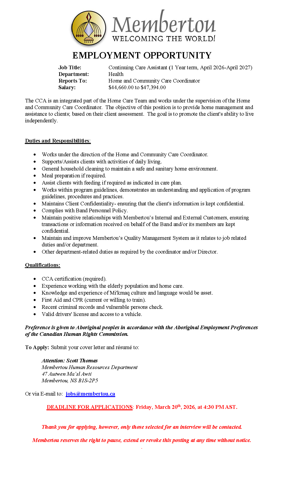 The Human Resources Department is located inside the Membertou Band Office at: 47 Autwen Ma’sl Awti.
